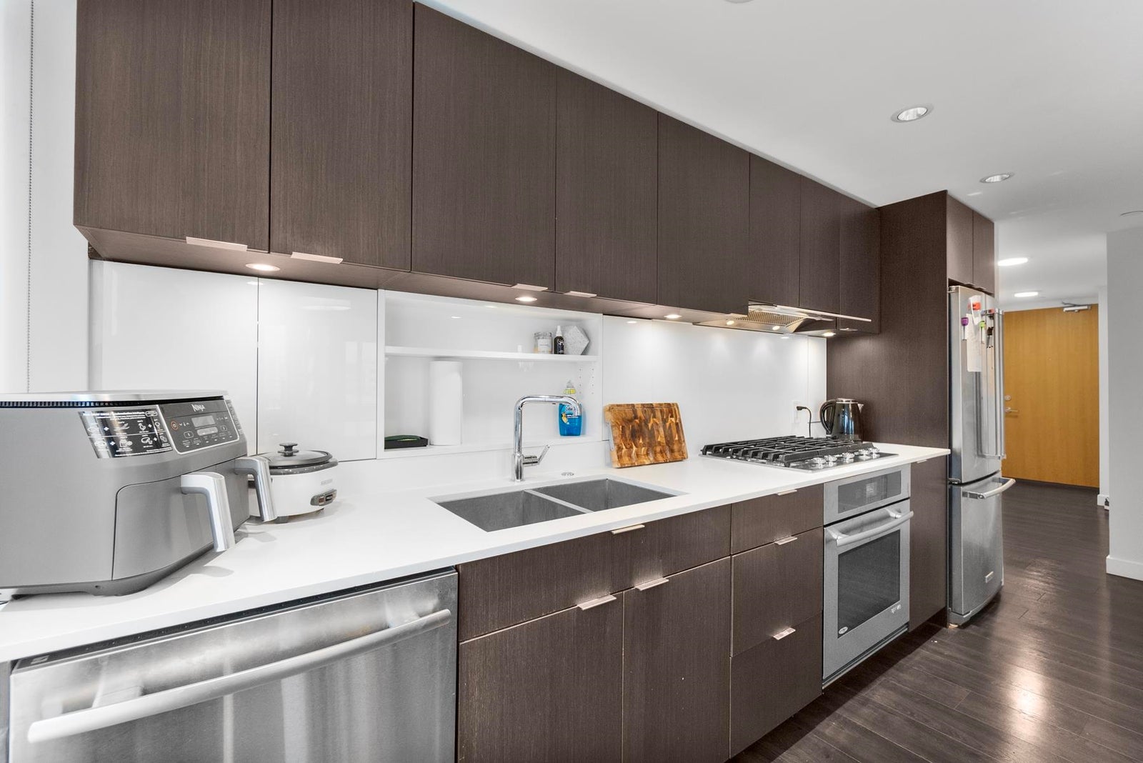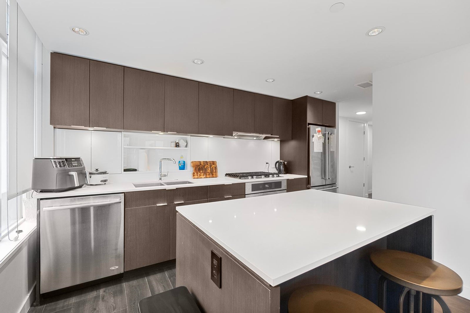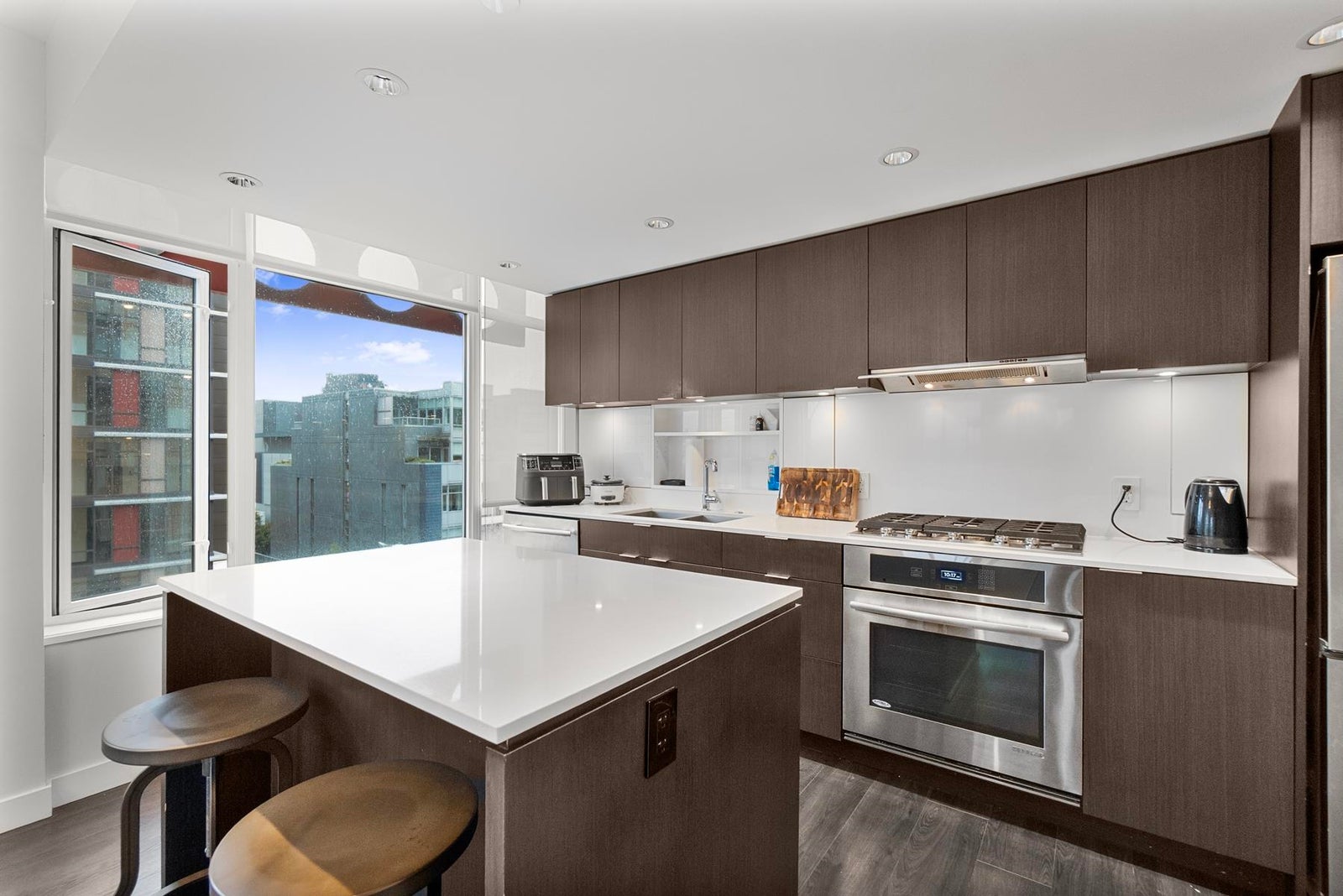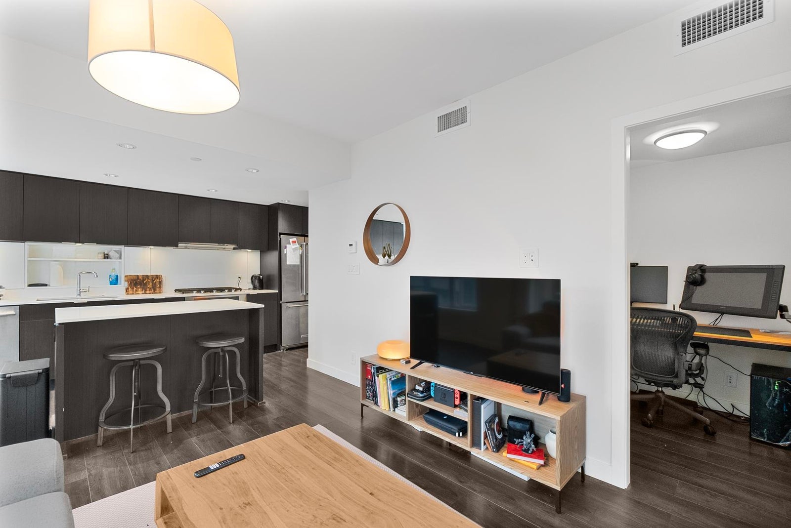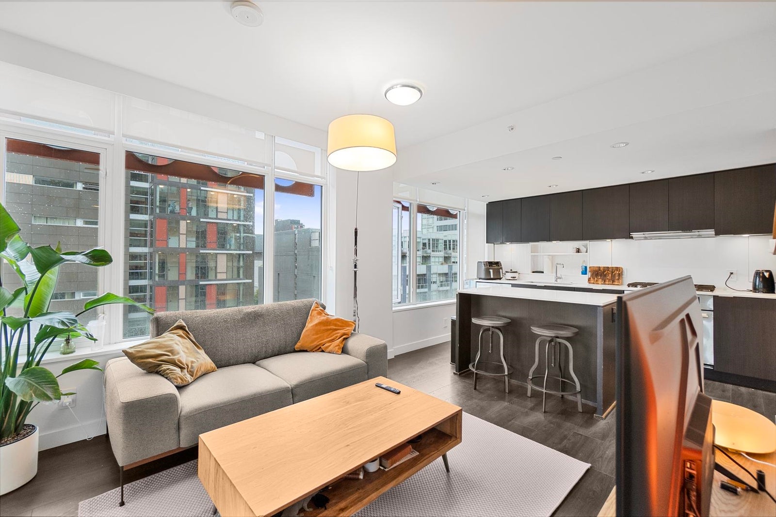 Welcome to this bright and versatile home at Block 100 by Onni. Thoughtfully designed, it features one bedroom plus two spacious dens—perfect for a home office, nursery, or guest space. The open living and dining area flows to a covered balcony, ideal for morning coffee or evening relaxation. A modern kitchen offers full-sized stainless steel appliances, sleek cabinetry, and quartz countertops. The bedroom provides ample closet space, while the dens add flexibility for work or creative use. Enjoy air conditioning, parking, and access to premium amenities including a fitness centre, lounge, and rooftop deck. Steps to the seawall, SkyTrain, cafés, and shops, this home delivers the best of urban living. An excellent choice for professionals or investors alike.