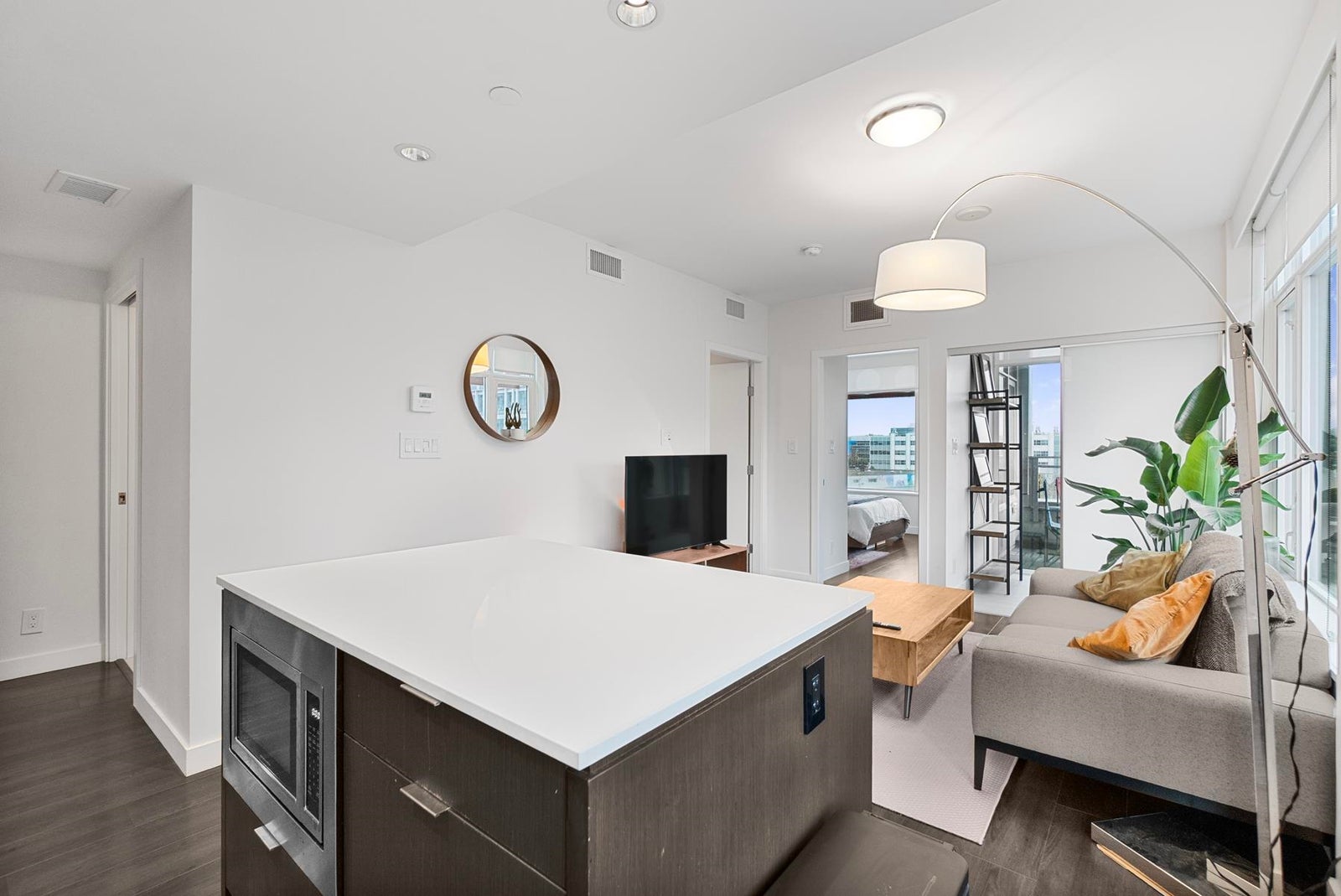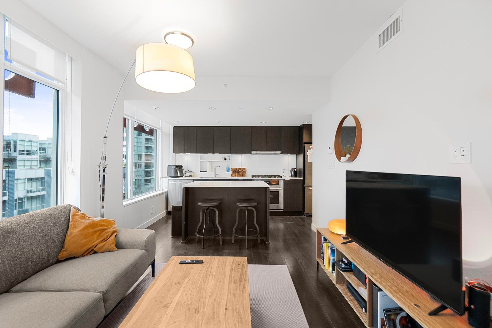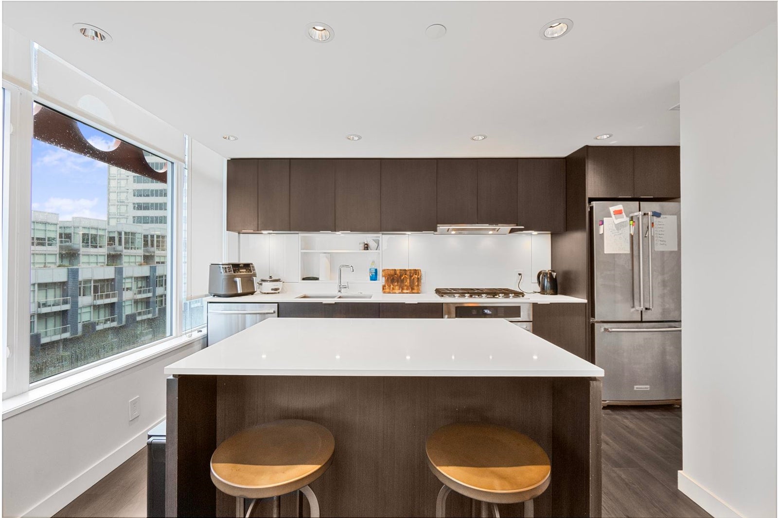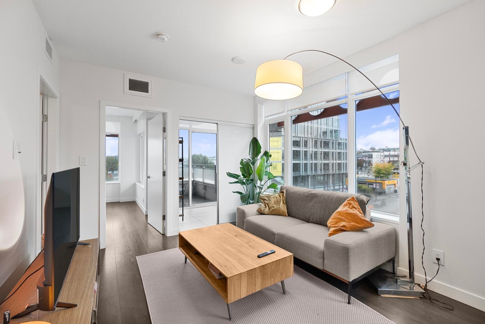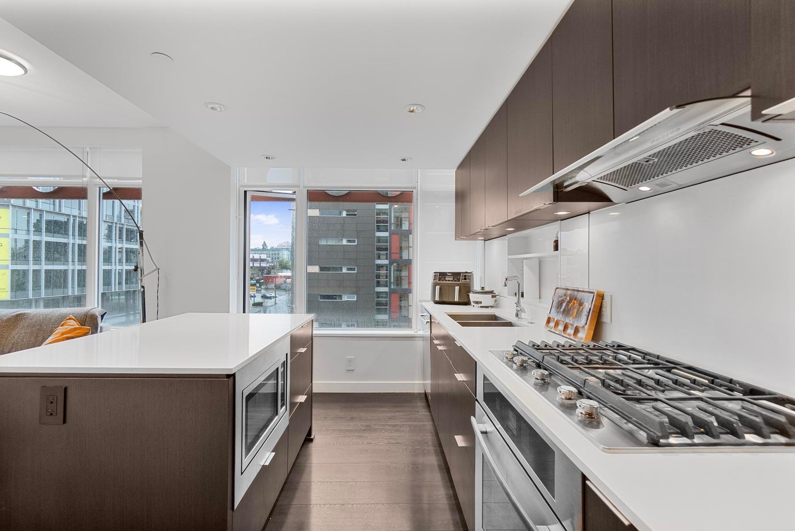 Welcome to this bright and versatile home at Block 100 by Onni. Thoughtfully designed, it features one bedroom plus two spacious dens—perfect for a home office, nursery, or guest space. The open living and dining area flows to a covered balcony, ideal for morning coffee or evening relaxation. A modern kitchen offers full-sized stainless steel appliances, sleek cabinetry, and quartz countertops. The bedroom provides ample closet space, while the dens add flexibility for work or creative use. Enjoy air conditioning, parking, and access to premium amenities including a fitness centre, lounge, and rooftop deck. Steps to the seawall, SkyTrain, cafés, and shops, this home delivers the best of urban living. An excellent choice for professionals or investors alike.